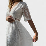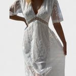 Ova boho čipkasta haljina donosi savršenu kombinaciju profinjenosti i opuštenog stila. Lepršava silueta i prekrasni čipkasti detalji čine je idealnim izborom za ljetne večeri, posebne događaje ili romantične šetnje uz more. Haljina koja naglašava ženstvenost i donosi bezvremensku eleganciju.