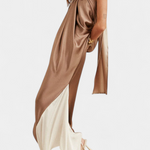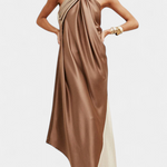 S dizajnom koji spaja senzualnost i modernost, haljina Petra ističe se svojim halter izrezom i potpuno otvorenim leđima. Njezina fluidna silueta, zajedno s igrom blokova boja, stvara elegantan i avangardan vizualni dojam. Savršena za one koji žele zasjati s povjerenjem na bilo kojem posebnom događaju.
