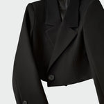 Minimalistički kratki sako s elegantnim dizajnom i modernim detaljima. Ovratnik s oštrim linijama i prednje kopčanje daju dinamičan karakter, dok kratki kroj čini idealnim za stylish pojave. Lako se nosi u poslovnim, ali i večernjim prilikama.