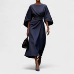 Rafinirana duga haljina s lađa izrezom i voluminoznim rukavima gradi profinjenu, arhitektonsku siluetu. Široki pojas ističe struk, dok raskošno padajuća suknja omogućuje slobodu kretanja i graciozan hod. Minimalistički detalji i čiste linije čine je savršenim izborom za svečane prigode, poslovne evente i večernje izlazke.