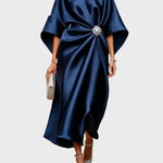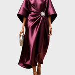 Isijavajući luksuz i bezvremensku eleganciju, ova saten haljina je epitom finese. Njen jedinstveni kroj u kombinaciji s dekorativnom kopčom ističe siluetu s diskretnim sjajem.