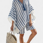 Morska svježina s opuštenim šarmom. Set Nancy ističe se oversized košuljom s prugama u mornarsko plavoj i bijeloj boji, u kombinaciji s elegantnim šortsevima za ljetni i bezbrižni izgled. Detalji poput dekoltea s dekorativnim resicama i tekstilnog završetka dodaju karakter i lakoću.