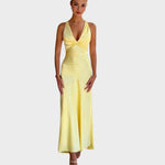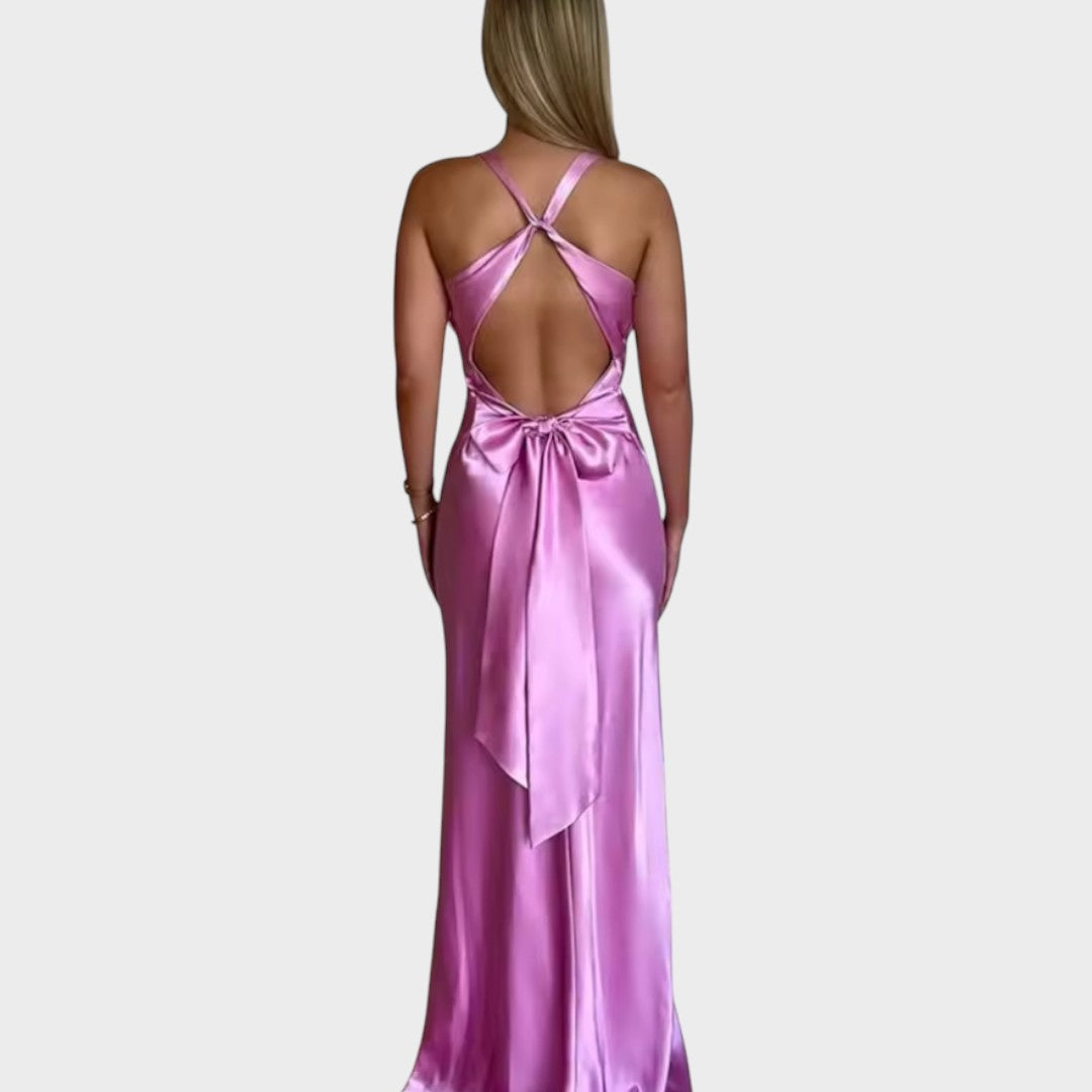 Istaknite svoju ženstvenost uz ovu elegantnu satensku haljinu. Mekani materijal i profinjeni kroj nježno prate liniju tijela, dok dekolte u obliku slova V dodaje dašak glamura. Savršena za posebne prilike ili ljetne večeri.