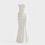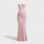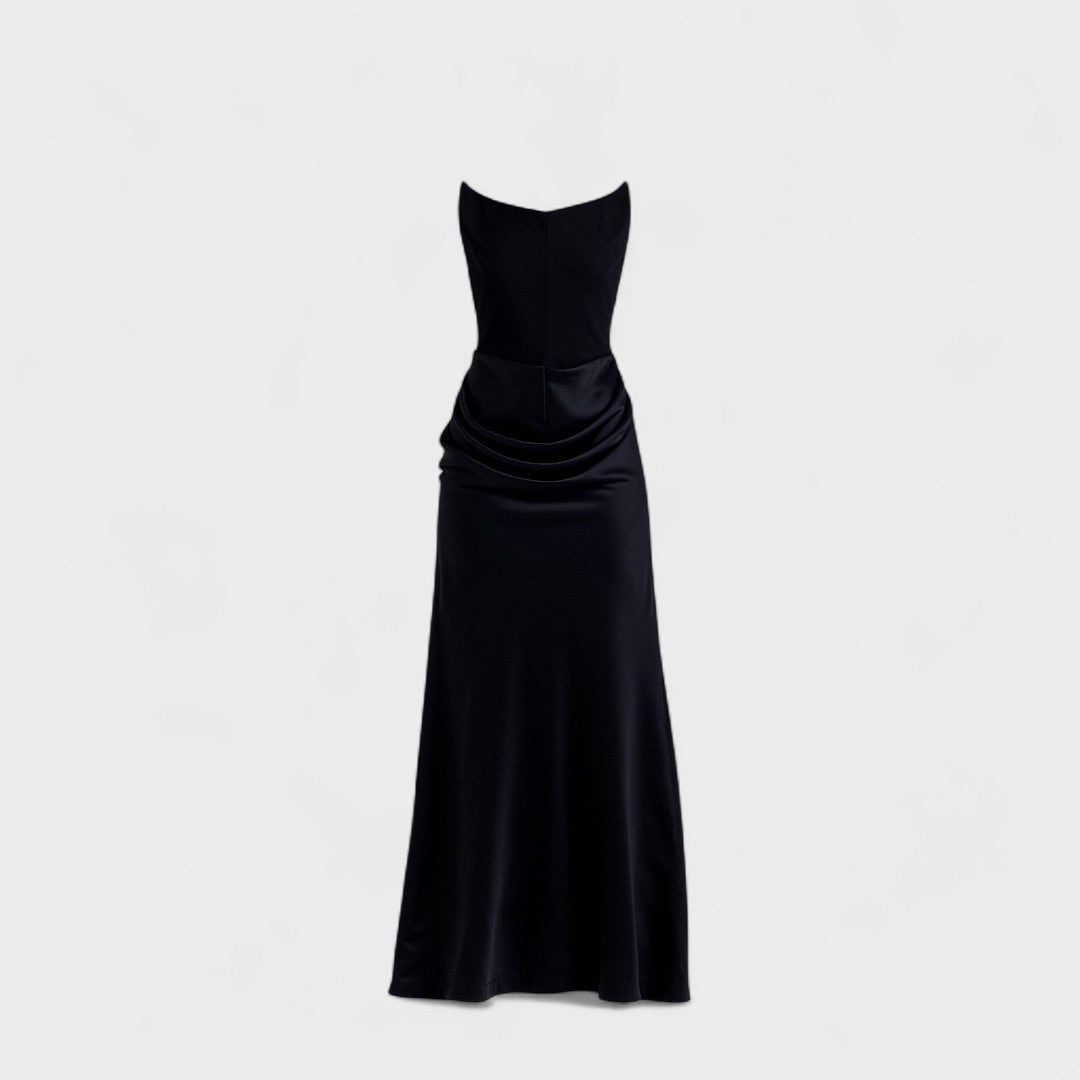 Haljina 'Radmila' predstavlja privremenu eleganciju u svom najljepšem izdanju. Ova haljina koja seže do poda ima bustier stil bez naramenica, izrađen od mat materijala koji pruža savršenu osnovu, dok umjetnički nabor u području bokova stvara zavidne oblike. Prilagođeni silueta prelazi u suptilno širenje ribljeg repa od sjajnog satena, koje svaki korak čini posebnim.