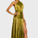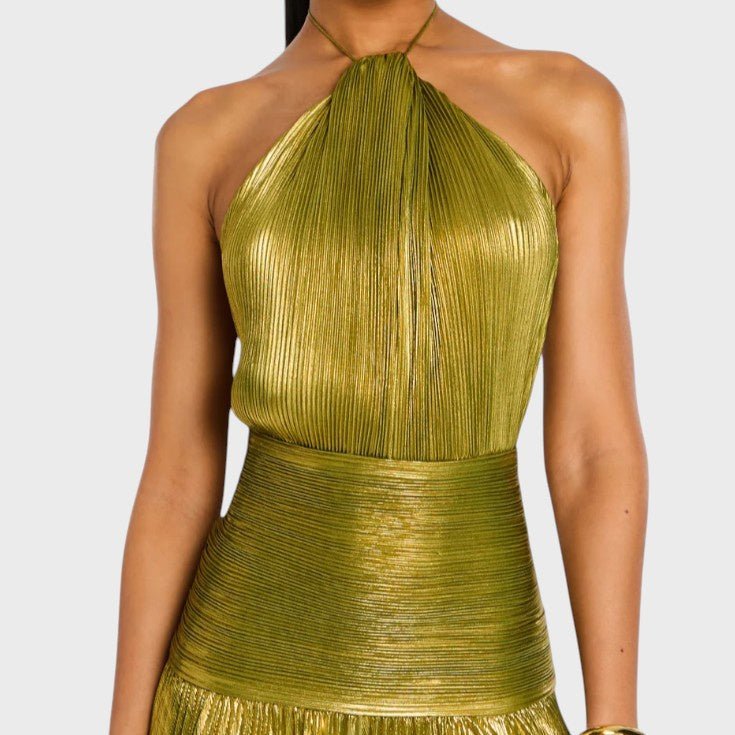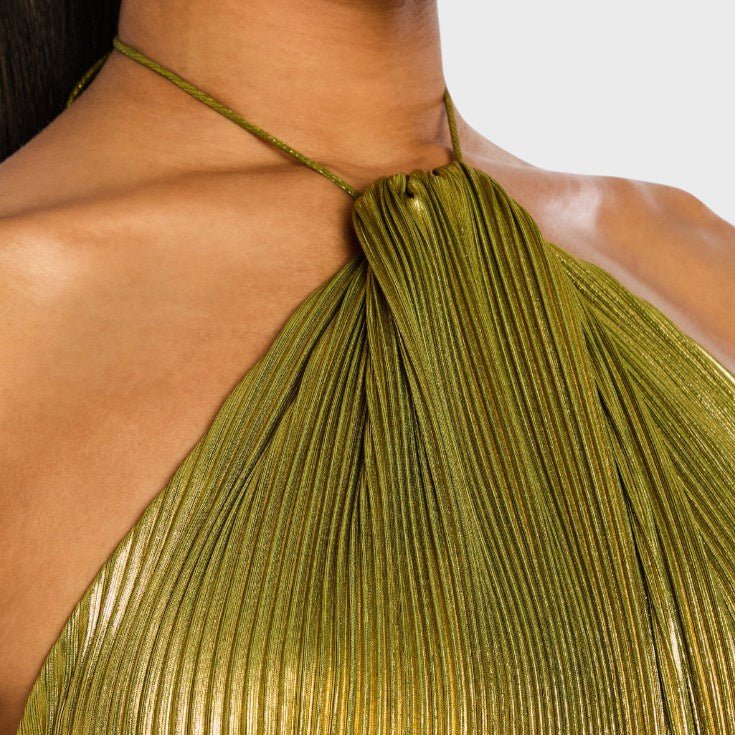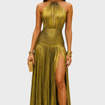 Haljina Vilma očarava svojim metalik peridot nijansom, lepršavim siluetom i rafiniranim detaljima. S halter izrezom, otvorenim leđima i visokim prorezom, spaja hrabrost i eleganciju – idealna za gala večeri, večere i nezaboravne noći, ispunjene mistikom i ženstvenošću.