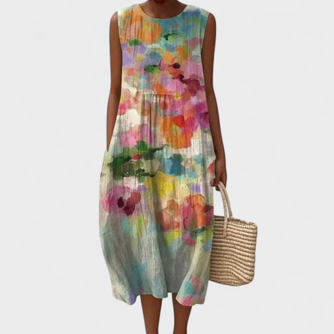 Ova lagana i prozračna haljina savršeno kombinira stil i praktičnost, dajući vam slobodu kretanja i sofisticiran izgled u svim prigodama. Njezin opušteni kroj i cvjetni uzorak čine je idealnim izborom za plažu, šetnju gradom ili ljetne susrete.