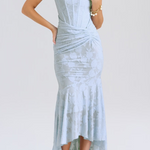 Impresivna haljina s prilagođenim krojem i reljefnim uzorkom koji elegantno obavija tijelo. Oblikovani korzet pruža potporu i ženstveni izgled, dok dobro osmišljene plisirane detalje u struku naglašavaju siluetu. Asimetrična suknja donosi pokret i luksuz svakom izgledu.