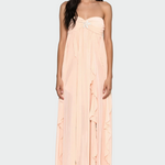 Elegantna maksimalna haljina s fluidnim pokretom i ženstvenom siluetom koja nježno obavija tijelo. Izražajan dekolte i tanke naramenice ističu vrat i ramena, dok struk pruža elegantan oblik. Idealna za vjenčanja, krštenja i svaku posebnu prigodu.