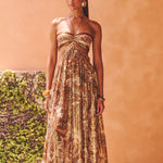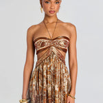 Impresivna maksi haljina s bogatim paisley uzorkom u nijansama zlata, smeđe i crvene. Strapless korzet s impresivnim izrezima ističe ženstvenost, dok lepršava suknja pruža pokret i eleganciju. Idealna za večernje izlaske, koktel zabave i ljetne prigode koje zahtijevaju glamurozan izgled.