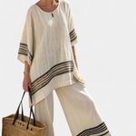 Smiren stil s bezvremenskim morskim osjećajem. Set Daisy privlači pažnju kombinacijom suprotstavljenih crnih linija i prirodne pozadine, izazivajući opuštenu eleganciju. Prostrana silueta i lagano platno čine ga savršenim suputnikom za tople klimatske uvjete i spore dane.
