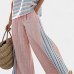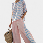 Slatkoća i lakoća u svakom koraku. Set Daisy u nijansama ružičaste i plave kombinira top s valovitim linijama s širokim i prozračnim hlačama, stvarajući svjež i udoban izgled idealan za sunčane dane uz more.