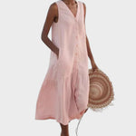 Ova elegantna haljina bez rukava savršena je kombinacija udobnosti i stila. Dizajnirana s V-izrezom i dugmadima sprijeda, haljina pruža ležeran, ali sofisticiran izgled. Prozračan kroj omogućava slobodu pokreta, dok praktični džepovi dodaju funkcionalnost. Idealna je za dnevne šetnje, odmore ili opuštena druženja.