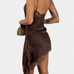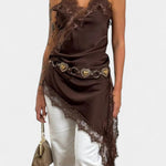 - Asimetrični rub s intrikatnom čipkom koja dodaje romantičnost