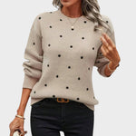 Ostanite stilizirano topli s Teodora pletenim puloverom s točkicama, savršenim spojem udobnosti i šarma. Izrađen od mekog pletenog materijala, ovaj svestrani komad ima bezvremenski okrugli izrez i suptilan dizajn s točkicama po cijeloj površini. Bilo da ga nosite s trapericama za opušteni vikend izgled ili ga oblačite s krojenim hlačama, to je nezaobilazni komad u garderobi.