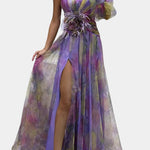 Izjava stila za događaje koji zahtijevaju prisutnost. Haljina Teodora kombinira skulpturalni dizajn s eterealnim detaljima, od asimetričnog izreza do drapirane suknje s prednjim izrezom. Akvarelni uzorak i cvjetni aplikacija na struku podižu njezinu eleganciju, stvarajući nezaboravnu siluetu za sofisticirane proslave.