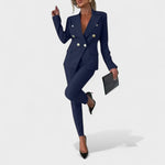 Sofisticirani komplet stvoren za žene koje žele izgledati profesionalno i samouvjereno. Dvoredni sako s dekorativnim gumbima oblikuje struk i daje savršenu strukturu, dok uske hlače cigareta kroja, dužine do gležnja, vizualno izdužuju siluetu. Udobna tkanina s blagim rastezanjem prati pokret i zadržava besprijekoran izgled od jutra do večeri. Džepovi s preklopom i čisti kroj čine ga idealnim za ured, sastanke i svečane prilike — nosite ga kao komplet ili odvojeno.